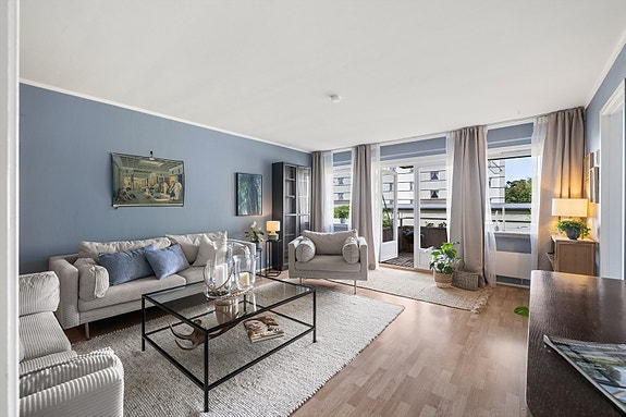 Lys og arealeffektiv 3-roms leilighet i høy 1. etg. Solrik balkong.
