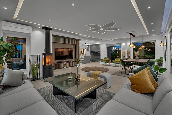 I 1. etasje finner du en lys entré, romslig stue med peis, moderne kjøkken, tre soverom og et delikat baderom. Etasjen er oppusset over tid, med blant annet nytt tilbygg, oppgraderte overflater og et stilrent kjøkken. Loftetasjen gir ekstra rom (ikke godkjent for varig opphold), og kjelleren inneholder både vaskerom og en leilighet - også denne er ikke godkjent for varig opphold. Oppvarming skjer via varmepumpe og peis, som gir både komfort og energieffektivitet.