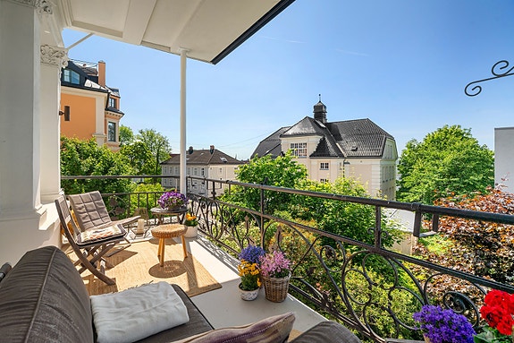 Stor, vakker hjørneleilighet med klassiske detaljer og stor balkong på 10m2. Frodig felleshage - sjelden mulighet!