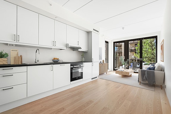 Pen 2-roms selveier på 53m² med markterrasse. Nybygg fra 2023. Vannbåren gulvvarme. Felles takterrasse med flott utsikt.