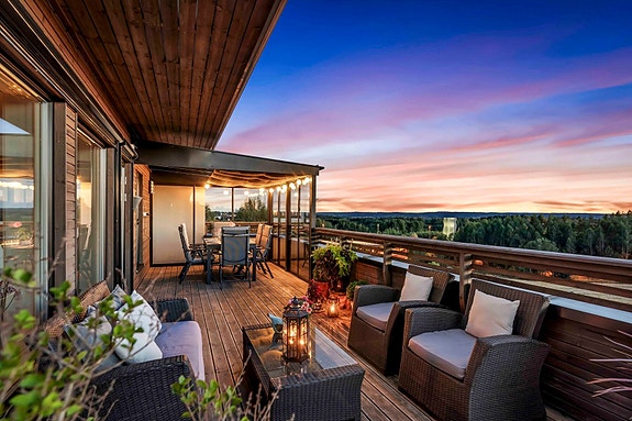Her har du 142 kvm areal på toppen av terrasseblokken og hele 50 kvm terrasse hvor ca. 10 kvm er inn-glasset. Nyt solen og fine sommerdager med sol frem til ca. kl. 22:30 midtsommers. Fra terrassen og de store vinduene i leiligheten har du flott utsyn over kulturlandskap og ingen innsyn.