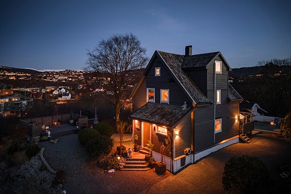 Stor enebolig i attraktivt strøk på Hop. Utsikt og gode solforhold. Unik tomt m/ muligheter. Kjellerleil (ikke godkjent)
