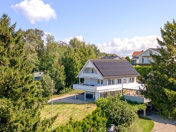 På idylliske Søndre Årum, midt mellom Fredrikstad og Sarpsborg, finner du Vardeveien 36 en stor og familievennlig enebolig over tre etasjer. Med hele 230 kvm bruksareal får du rikelig med plass til både hverdag og livsutfoldelse. Boligen rommer fem soverom, tre bad ett i hver etasje og et eget rom som brukes som hjemmekino. Her er det lett å trives! Solide materialvalg, vannbåren gulvvarme og solcelleanlegg fra 2020 gir både komfort og lavere driftskostnader. Den flislagte garasjen i underetasjen byr på ypperlige muligheter for mekking, lagring eller hobbyprosjekter. Ute venter flere uteplasser med gode solforhold og fin utsikt mot det åpne jordbrukslandskapet. Beliggenheten gir en god kombinasjon av landlig ro og sentral nærhet til det du trenger i hverdagen.