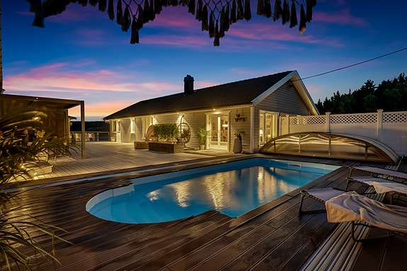 - Basseng, bassengtak og utedusj. Appstyrt renseanlegg og varmepumpe til bassenget.