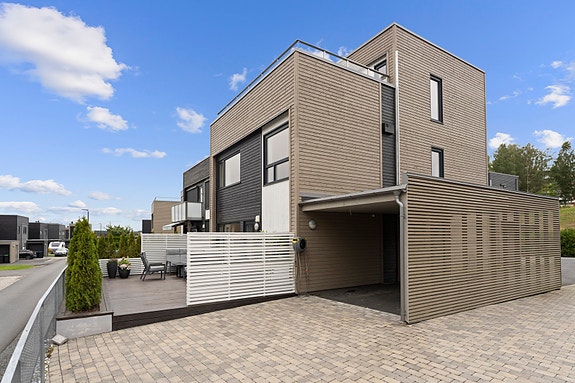 Moderne og populære townhouse fra 2018 m/​takterrasse. Carport & bod. Skole, bhg & sentrum like ved.