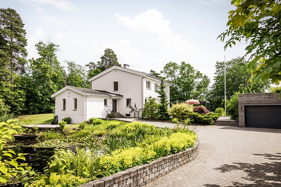 Den store parklignende hagen omkranser huset og skaper en unik privat atmosfære. På eiendommen finner du dobbelgarasje, privat dam/tjern med robåt og mulighet for egen skøytebane på vinter samt flere flotte uteplasser med en nyoppført pergola