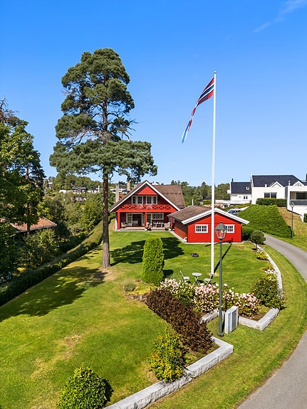 Stor enebolig med høy kvalitet på sjeldent vakker og solrik eiendom nær sjøen. Strandparsell med brygge og sjøbod.