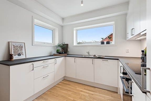 Foto: EFKT v/Hamish Gray. Endeleilighet midt i Levanger sentrum. Lys og fin leilighet med vindusflater på 3 sider av leiligheten. Skjermet kjøkkenkrok med vindu over kjøkkenbenken både mot nord og mot vest.