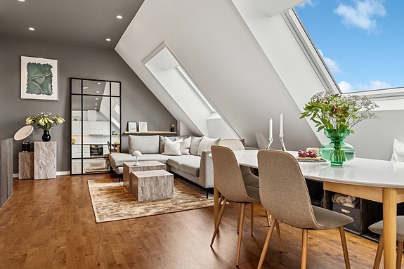 Toppleilighet midt i Trondheim sentrum. Oppgradert og moderne leilighet. Store takvindu med utsikt mot fjorden. Heis.