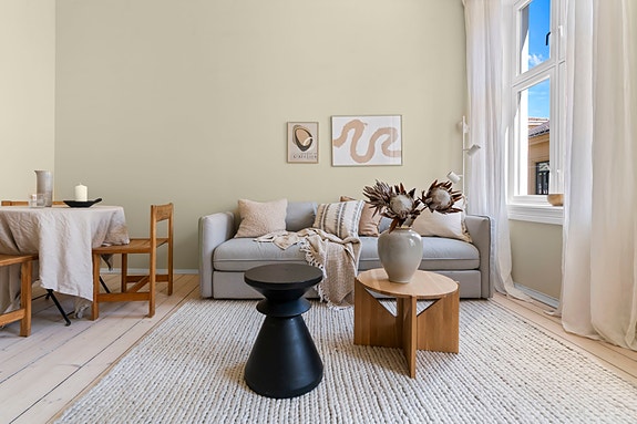 Leiligheten er gjennomgående med lys fra to sider. Alle vegger i leiligheten har nylig blitt sparklet og malt i tidsriktige farger, samt nylig slipte originale tregulv. Flotte klassiske elementer som rosett og langstrakte klassiske vinduer understreker historien til både leiligheten og bygården