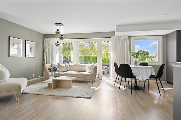 Innvendig finner du et lyst og åpent oppholdsrom med stue og kjøkken i åpen løsning. Rommet ble oppgradert i 2021 med nye overflater, nytt gulv og et moderne kjøkken med integrerte hvitevarer. Fra stuen har du direkte utgang til terrassen, som også ble oppgradert samme år.
