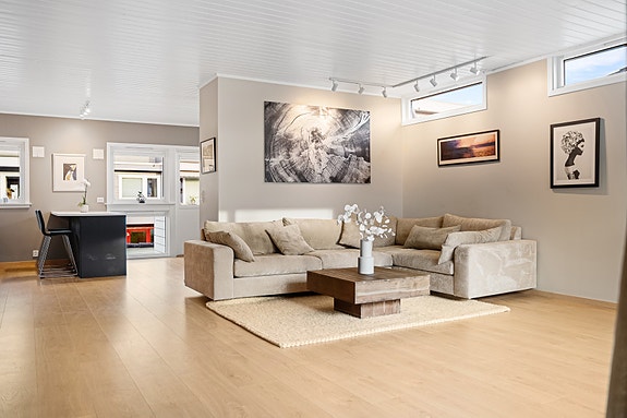 Stor terrasse med svært gode solforhold, 2 romslige soverom (opprinnelig 3). Separat vaskerom. Garasje med mulighet for parkering foran, egen oppmerket p-plass og EL-lader medfølger.