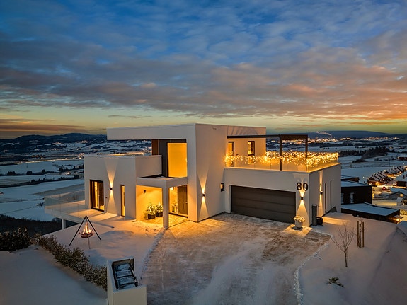 Velkommen til denne eksklusive, arkitekttegnete boligen med fantastisk beliggenhet på toppen av Løvset.