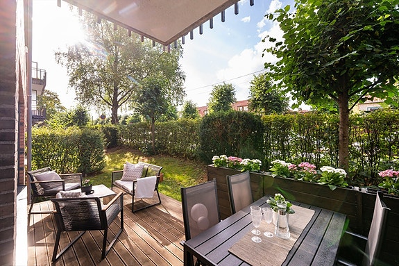 Romslig og godt velholdt 3-roms med solrik terrasse på 18 kvm.- fjernvarme og internett inkl. - T-bane og buss like ved