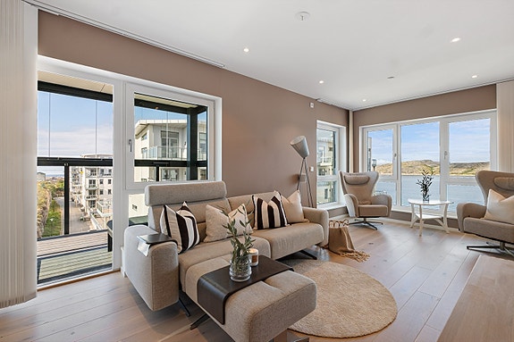 Moderne og stilren frontleilighet fra 2023 i 5. etasje med vakker sjøutsikt, to balkonger (én innglasset), og garasjeplass. Planløsningen består av entré, gang, moderne bad, lekkert kjøkken og to romslige soverom. I tillegg medfølger ekstern bod på ca. 5 kvm. Det er heis i bygget for enkel adkomst.