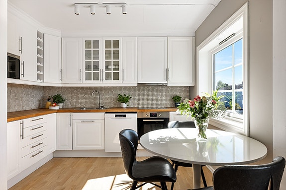 Meget smakfullt kjøkken med gode oppbevaringsmuligheter i over- og underskap.