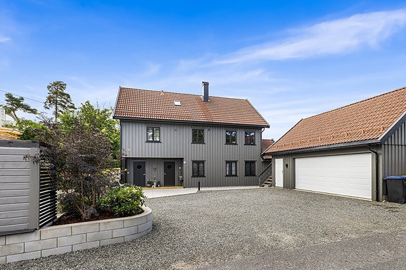 Tomten er pent opparbeidet med lekre beplantninger og har flere uteplasser med solrike soner. Dobbelgarasje med innredet loft og romslig gårdsplass gir rikelig med parkeringsmuligheter.