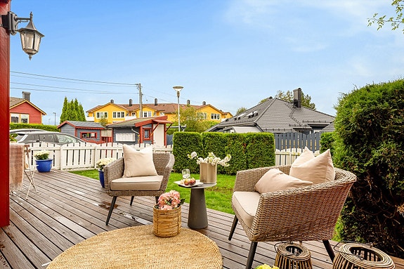 Romslig og sjarmerende endeleilighet med stor uteplass | Fast parkeringsplass | Barnevennlig og sentralt beliggenhet.