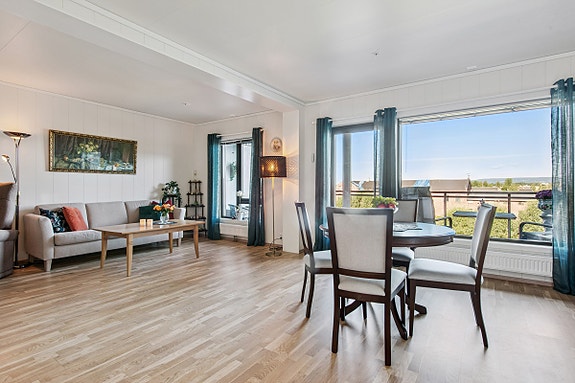 Leiligheten tilbyr en åpen stue-/kjøkkenløsning og to gode soverom. Fra stuen er det utgang til en solrik, overbygget balkong på ca. 11 m² med solskjerming.