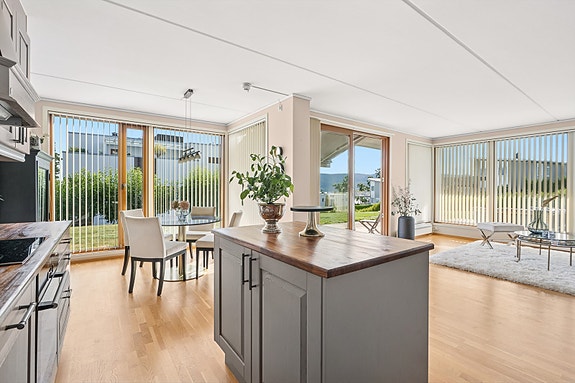 Midtpunktet i rommet er den romslige kjøkkenøya - perfekt som ekstra arbeidsflate, sosial samlingsplass eller serveringsbord når du har gjester.