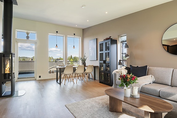 Plass til både spisestuemøblement i tilknytning til kjøkkenet, og avslappende sofa i stuen.