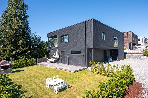 Tomten er pent opparbeidet med hekk og gruset gårdsplass som skaper et velstelt førsteinntrykk. Utvendige screens sørger for effektiv solskjerming og redusert innsyn.