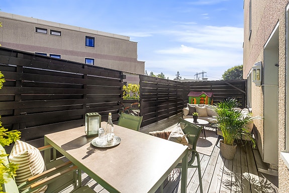 Velkommen til Møllefaret 26A - presentert av Malin Anker-Larsen. Solrik og meget romslig markterrasse med god plass til hjørnesofa, spisebord og lekeareal til barna.