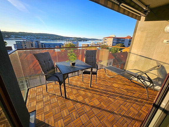 Moderne selveierleilighet med sjøutsikt, garasjeplass og heis - midt i Moss sentrum. Her bor du høyt og luftig i 4. etasje, med flott sjøutsikt, ettermiddags- og kveldssol fra balkongen, og kort vei til alt sentrum har å by på.