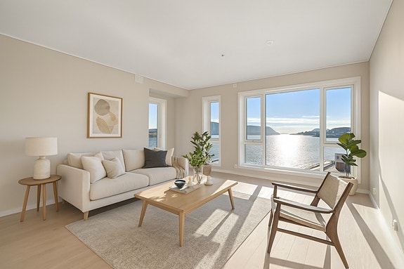 Innbydende, ny toppleilighet med moderne standard og flotte uteområder. Panoramautsikt mot vakre Borgundfjorden.