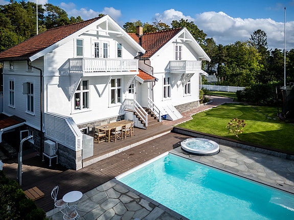 Uteområdet er intet mindre enn spektakulært, med svømmebasseng, jacuzzi, solrike terrasser og en pent opparbeidet hage. Her kan man nyte rolige sommerdager og lune kvelder i omgivelser som minner mer om et privat resort enn en vanlig enebolig.