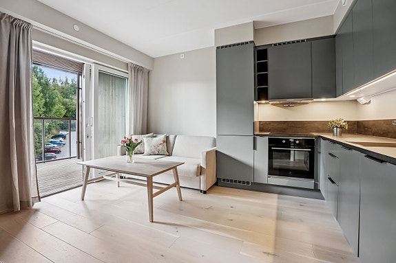 Velkommen til en moderne og lettstelt leilighet i 3. etasje, oppført i 2023. Leiligheten byr på en arealeffektiv planløsning med åpen stue- og kjøkkenløsning, ett soverom, flislagt bad og entré.