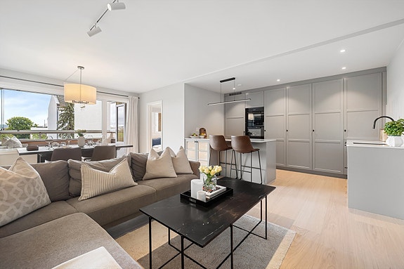 Strøken, delikat og påkostet 4-r med to balkonger og utsikt. Leiligheten ble totaloppusset i 2024, og holder høy standard med et moderne uttrykk. Det kan nevnes nytt kjøkken fra Drømmekjøkkenet, rålekkert bad, stilrene overflater, etablert ekstra soverom og oppgradert el-anlegg.