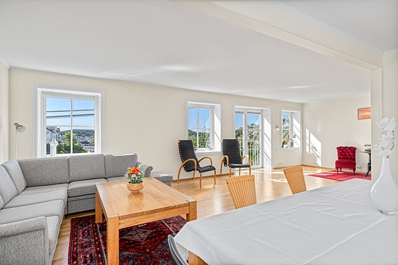Leiligheten byr på en lys og luftig stue med god plass til både sofagruppe og spisestue. Herfra har du flott utsikt over byen, samt utgang til en dobbel dør med fransk balkong som slipper inn godt med dagslys. Kjøkkenet er innredet i hvit utførelse og har rikelig med både skap- og benkeplass.