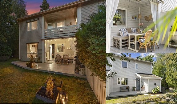 Flere uteplasser: Stor terrasse og hage. Veranda fra annen etasje. Uteplass ved inngangsparti.