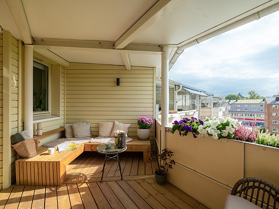 Dette er en lys og tiltalende 3-roms toppleilighet. Boligen har en fin og meget godt utnyttet planløsning. Her får du en innbydende stue med plass til hjørnesofa og spisebord, i tilknytning til en åpen kjøkkenløsning. Videre får du et pent flislagt bad, to soverom og en innbydende entré. Her får du også gleden av en herlig balkong på hele 10 kvm med gode solforhold og frodig utsyn. Leiligheten er pusset opp de siste årene og holder en god standard med moderne, delikate farge- og materialvalg.