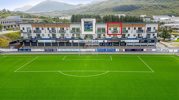 Velkomen til Høddvollvegen 43. Leiligheit ramma inne i rødt