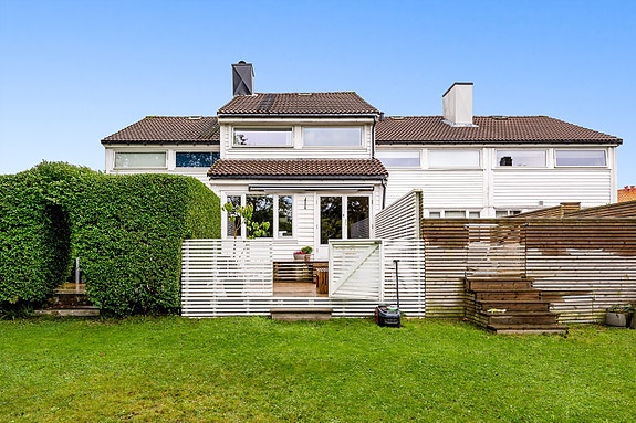 Lyst og innholdsrikt påbygd rekkehus med solrik uteplass. Innredet kjeller.