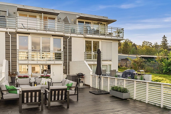 Lyst og innbydende rekkehus o/3 plan. Fantastiske uteplasser og sol fra morgen til kveld. Garasje. Barnevennlig. Utsikt.
