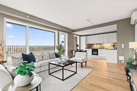 Velkommen til en nyoppført og moderne 2-roms leilighet i 5. etasje. Som hjørneleilighet får boligen godt lysinnslipp og en luftig atmosfære, med vindusflater og sol fra flere sider. Leiligheten har en åpen og romslig stue-/kjøkkenløsning på ca. 30 m², med utgang til en stor balkong på 14 m². Soverommet er av god størrelse og har egen balkong på 4,5 m².