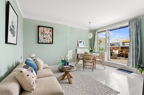 Toppleilighet med vestvendt terrasse på 26 kvm i rolig blindvei like ved Slottsparken. Fyring inkl
