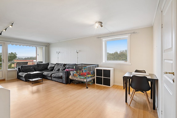 Her bor du høyt og fritt i byggets øverste etasje, helt på enden, med et ekstra vindu i stuen. Leiligheten er gjennomgående og har en god planløsning med luftige rom. Fra stuen er det direkte adkomst til en vestvendt balkong på 7 m2.