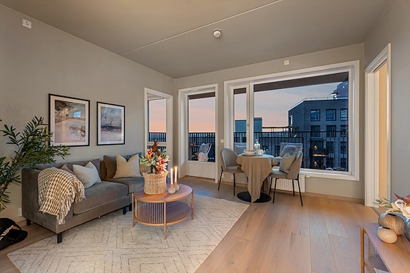 Fastpris: Ny 2-roms m/​ca. 6 kvm sydvestvendt balkong i 3. etg. Garasjepl. Sikte på ot.15-26.juni 26
