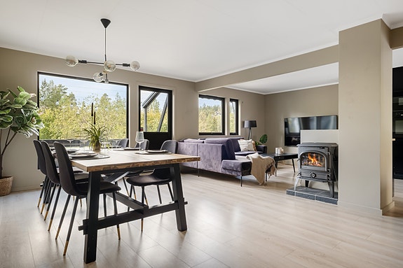 Boligen ble i 2023 betydelig oppgradert med nytt kjøkken og nye overflater i 1.etasjen. Dette er en sosial sone med god plass til langbord og sofakrok. Kjøkkenet er lekkert med god skap- og benkplass. Det er peis i stuen som gir god varme og stemning på den kaldere tiden av året.