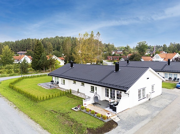 Eiendommen ligger solrikt til på en romslig tomt i et etablert og barnevennlig boligområde. Her bor du med gangavstand til barnehage, barneskole og flotte turmuligheter. Ungdomsskole, videregående og servicetilbud i Åmot sentrum er også i nærheten. Det er ca. 20 minutter til Hokksund og ca. 40 minutter til både Drammen og Hønefoss.