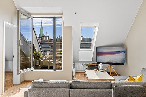 Nydelig toppleilighet med beliggenhet midt i sentrum, med byens yrende folkeliv rett utenfor døra. Likevel ligger du tilbaketrukket i toppetasjen, med privat balkong og to felles takterrasser. Leiligheten er fra 2013 og holder dermed en meget høy teknisk standard.