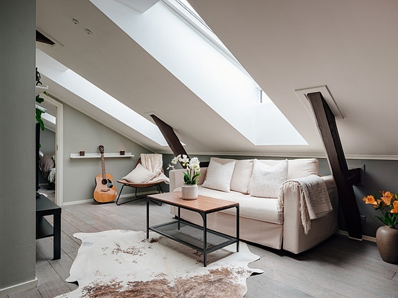Skråtak og synlige bjelker gir leiligheten karakter og sjel. Gjennomtenkt planløsning gir godt utnyttet areal og nyere oppgraderinger sørger for et moderne preg.