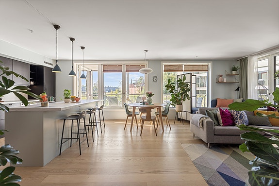 Påkostet og nydelig hjørneleilighet fra 2022. Solfylt balkong på 30 m². Fritt og hyggelig utsyn. To bad. Garasjeplass.
