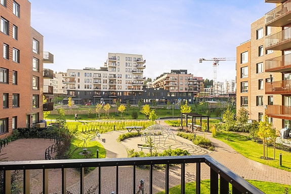 Hyggelig utsikt over fellesområdene. Bilfritt.