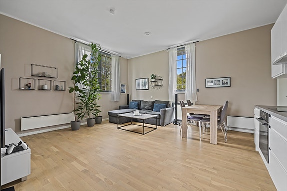 Kabelhuset på Notodden - Det er høyt under taket og høye vinduer gir godt med lys inn i leiligeten. Boligen har balansert ventilasjonsanlegg.