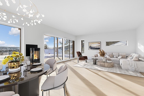 Leiligheten har en lys og innbydende entré med flislagt gulv og behagelig gulvvarme. Videre finner du et stilrent bad og tre romslige soverom. Stuen og kjøkkenet i åpen løsning med direkte utgang til en hyggelig uteplass. Det er gulvvarme i alle oppholdsrom, og en peis i stuen for ekstra kos og hygge.